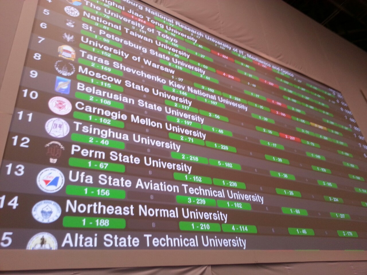 Less than an hour remains in the ICPC World Finals. The scoreboard has been frozen to keep everyone – including the teams and coaches – in suspense about the final results.