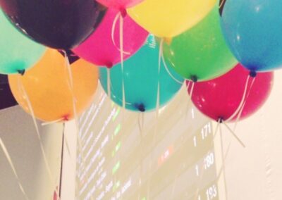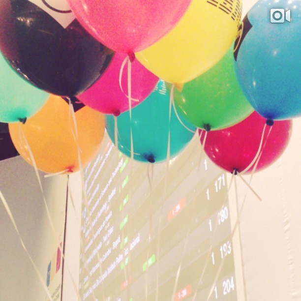 Trophy, balloons, live scoreboard and contestants. A view from the contest floor at the Jubilee Sports Palace in St. Petersburg.